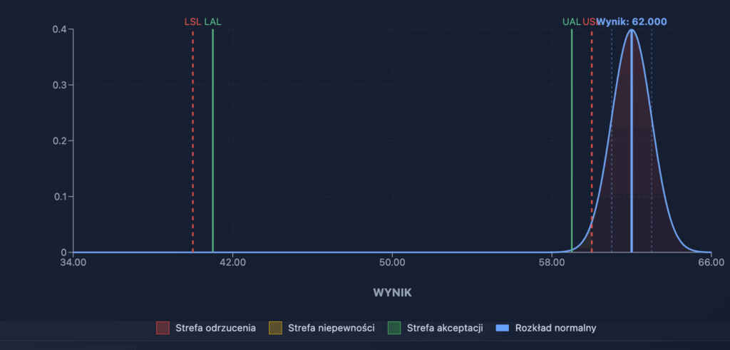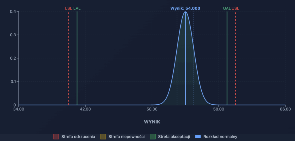 Pasmo ochronne ma typowo wartość równą rozszerzonej niepewności pomiaru na stronę (łącznie 2xU). Pamiętajmy też, że mając na myśli „wynik” czy „wartość zmierzoną” operujemy rozkładem normalnym, krzywą Gaussa o poziomie ufności ok 95% przy k=2 (2 odchylenia standardowe w lewo i prawo od wartości zmierzonej).