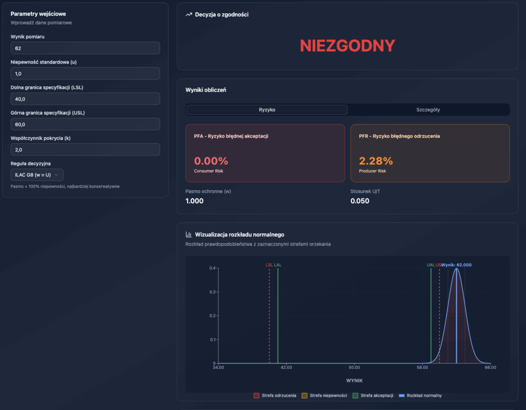 - Jako że wynik pomiaru ma charakter zmiennej losowej i poruszamy się w obszarach prawdopodobieństwa, decyzja o zgodności może być inna niż tylko zgodny/ niezgodny
