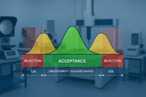 - Pasmo ochronne: Dla rozkładu normalnego, aby uzyskać 95% prawdopodobieństwo zgodności, stosuje się współczynnik pasma ochronnego wynoszący 1,65 (2×0,83) złożonej niepewności standardowej