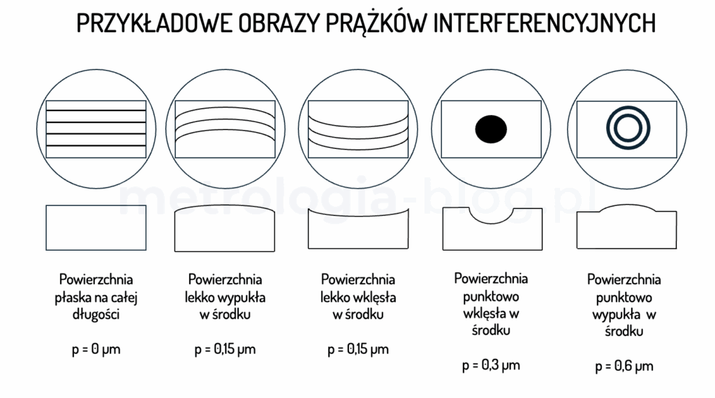 Ponieważ grubość klina powietrznego zmienia się w zależności od kształtu badanej powierzchni, prążki interferencyjne stanowią odwzorowanie – mapę konturową tej powierzchni. Każdy sąsiedni prążek (np. jasny) odpowiada zmianie grubości klina o dokładnie (λ / 2). Jest to podstawowa zasada, która pozwala na ilościową ocenę odchyłek od płaskości. W świetle białym lub pomarańczowym (stosowanym np. w specjalnych urządzeniach do oceny prążków) odstęp między dwoma sąsiednimi prążkami tego samego koloru oznacza zmianę odległości (szczeliny) między płytką a przedmiotem o połowę długości fali światła (λ / 2).