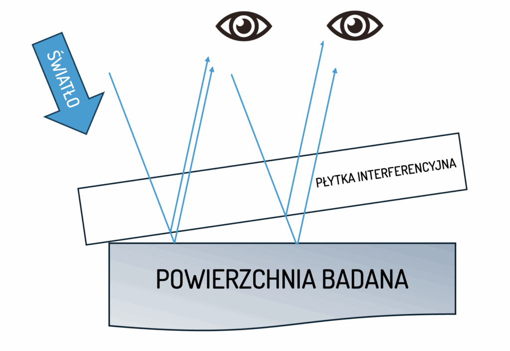 - Wiązka 1: Odbija się od dolnej powierzchni płytki szklanej wzorcowej (powierzchnia odniesienia).